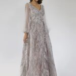 Make it your moment to stand out wearing this glitzy party dress from SAMINA MUGHAL. The fitted bodice has a V-neckline and long bishop sleeves. An overall embroidered pattern gives this dress an outstanding appeal. The fit-and-flare dress flourishes elegantly from the waist into an A-line silhouette skirt, ends with a floor-length hem and a subtle sweeping train.